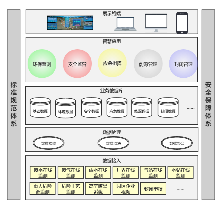 智慧系统采用多层架构设计,包括接入终端、传输网络、平台层、智慧应用层、展示层、服务对象。其建设内容包括软件功能建设(安全层面、环保层面、应急层面、封闭管理层面、能源层面)和硬件建设。