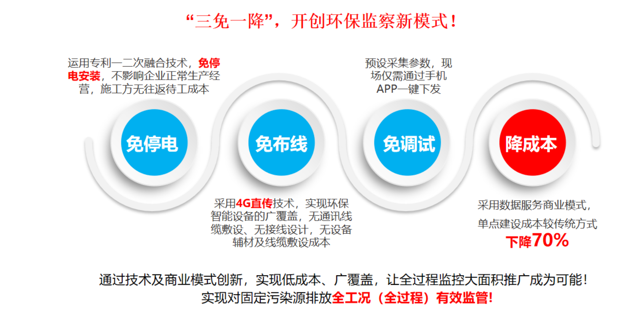 技术方案利用先进的物联网技术实现用户环保分路工况采集的低成本建设,公司通过科技创新,实现“三免一降”(即免停电、免布线、免组网,降成本),开创环保监察新模式。在项目实施过程中不影响企业正常生产,同时使系统建设综合成本降低约70%,让环保“全过程监测”大面积推广成为可能。